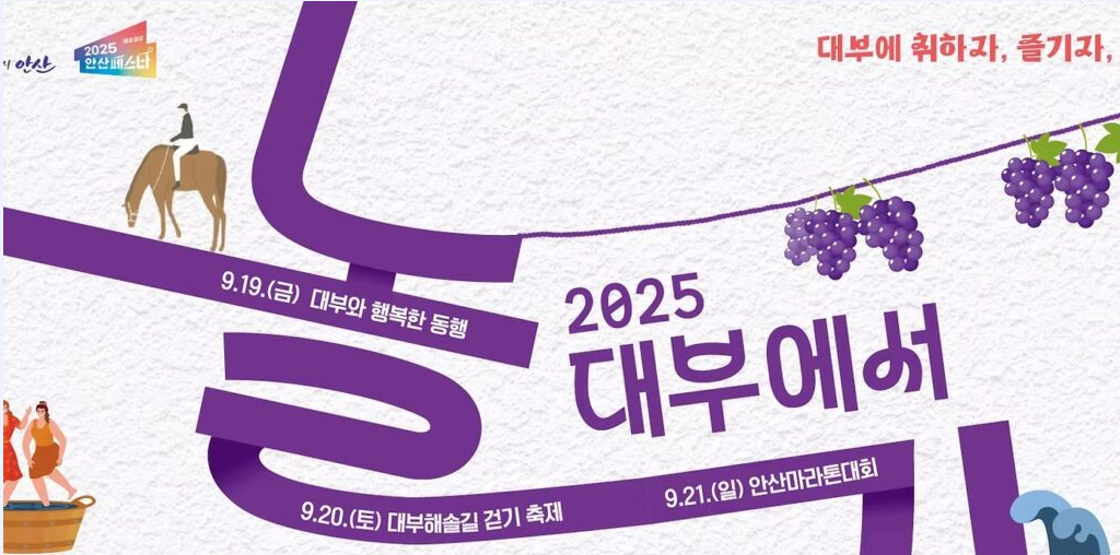 | 안산 대부포도축제 | 경기 안산시 대부도 바다향기테마파크 | 9/19~9/21 | 무료 | 포도 직거래, 마라톤·걷기 축제 동시 진행 |